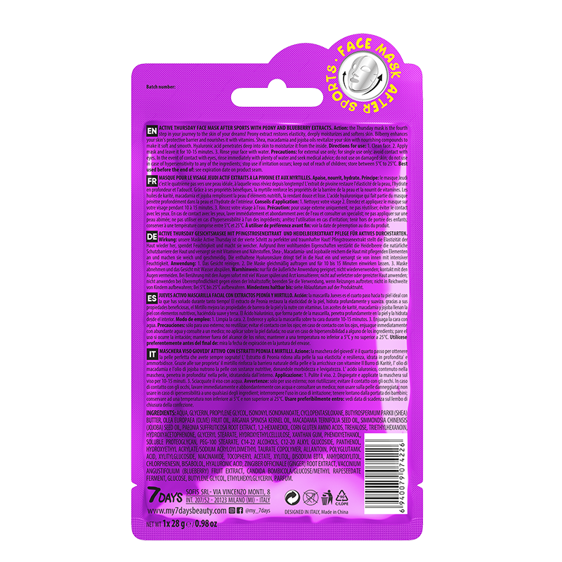 7DAYS Face mask ACTIVE THURSDAY After sports with Peony and Blueberry, 28 g