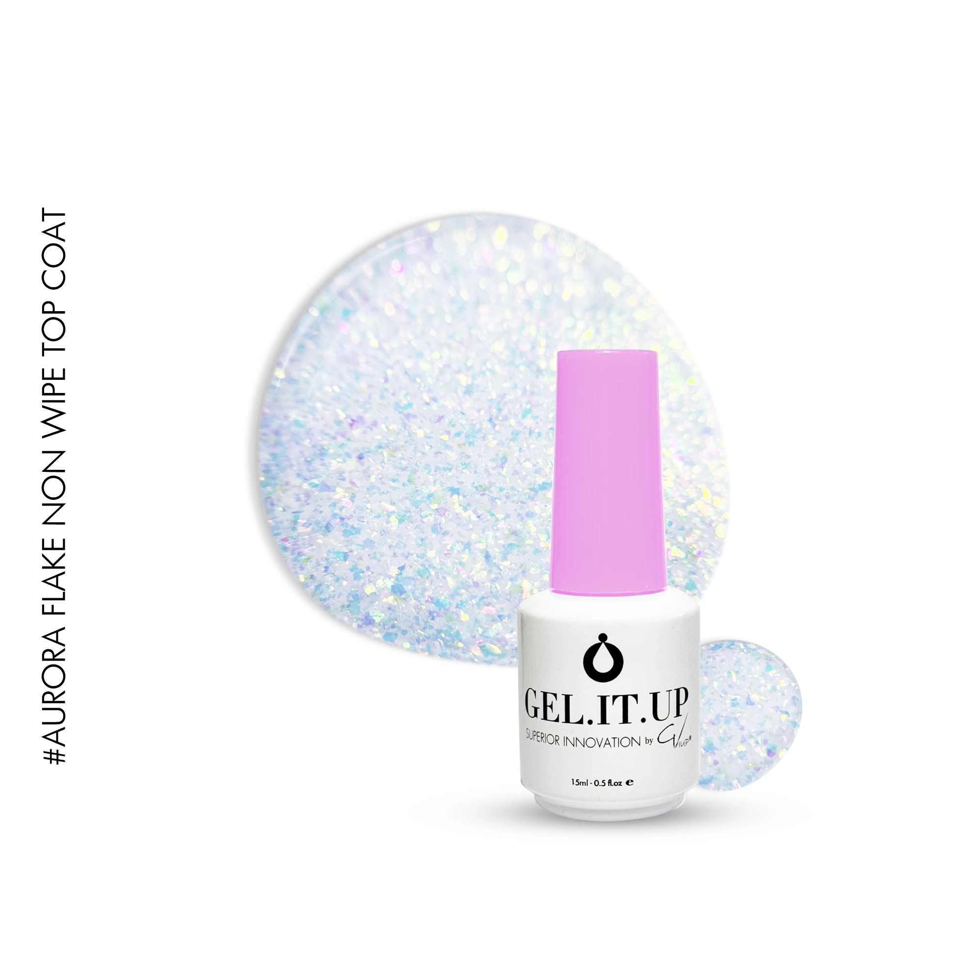 Το Aurora Flake Non Wipe Top Coat περιέχει νιφάδες διαφορετικού μεγέθους δημιουργώντας ιριδίζουσες λάμψεις για ένα εκθαμβωτικό αποτέλεσμα. Οι νιφάδες είναι λεπτές αφήνοντας ομοιόμορφη επιφάνεια στο πέρασμα του και μπορεί να μετατραπεί σε mat τοποθετώντας το Satin Matte Top Coat.