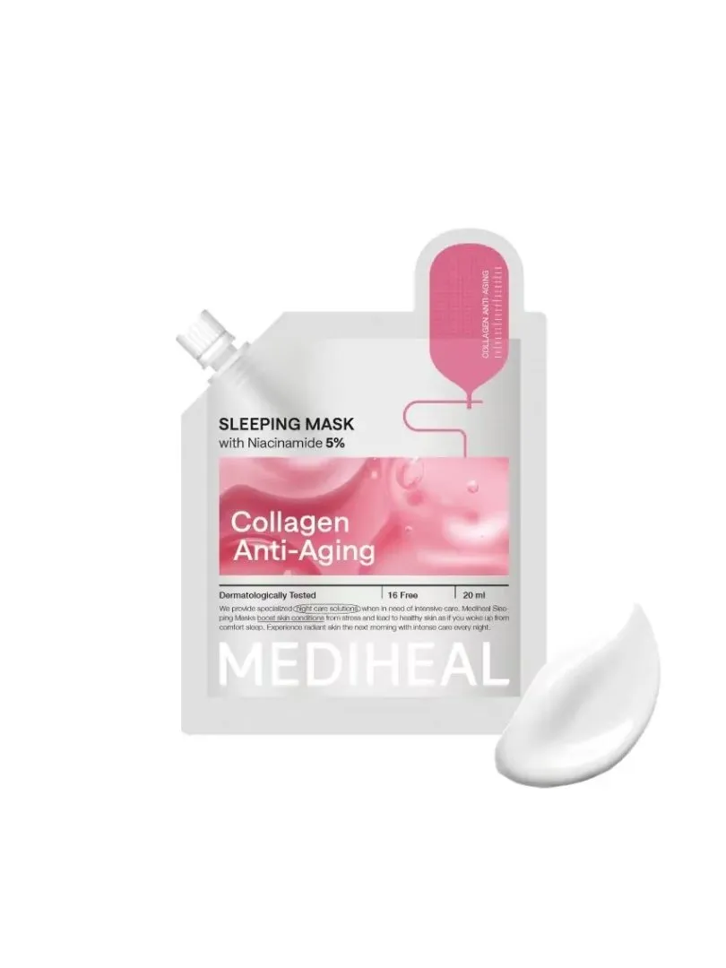 Ενυδατική μάσκα νυκτός με κολλαγόνο, 20ml.Η Mediheal Collagen Sleeping Mask είναι μια καινοτόμα μάσκα νυκτός, σχεδιασμένη να επαναφέρει τη νεανική όψη του προσώπου σας ενώ κοιμάστε. Εμπλουτισμένη με υδρολυμένο κολλαγόνο, ελαστίνη, προβιταμίνη B5 και ενυδατικούς παράγοντες, ενισχύει την ελαστικότητα και συσφίγγει την επιδερμίδα, μειώνοντας ορατά τις λεπτές γραμμές.
