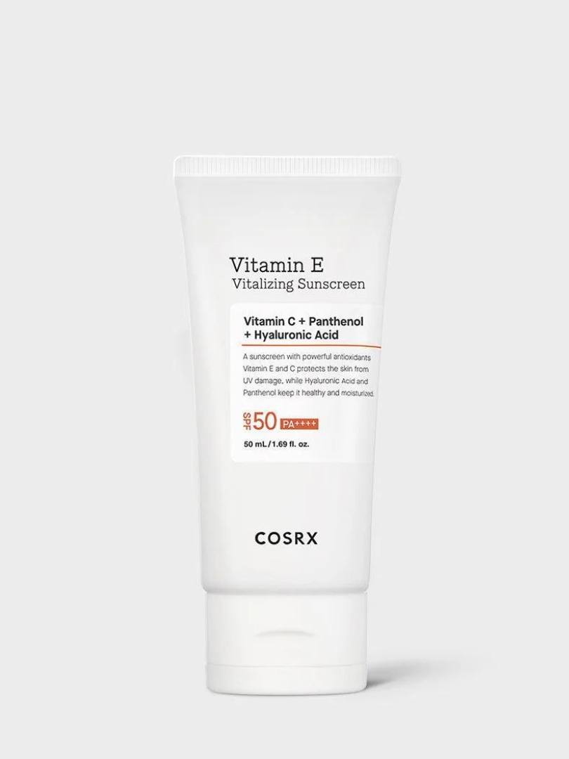 “Ενυδατικό καθημερινό αντιηλιακό με υψηλή προστασία που φροντίζει την επιδερμίδα.Το COSRX Vitamin E Vitalizing Sunscreen SPF 50++++ είναι ένα αντηλιακό με ισχυρή αντιοξειδωτική δράση. Οι βιταμίνες Ε και C προστατεύουν το δέρμα από τις βλάβες που προκαλεί η υπεριώδης ακτινοβολία, ενώ το Υαλουρονικό Οξύ και η Πανθενόλη το διατηρούν υγιές και ενυδατωμένο.